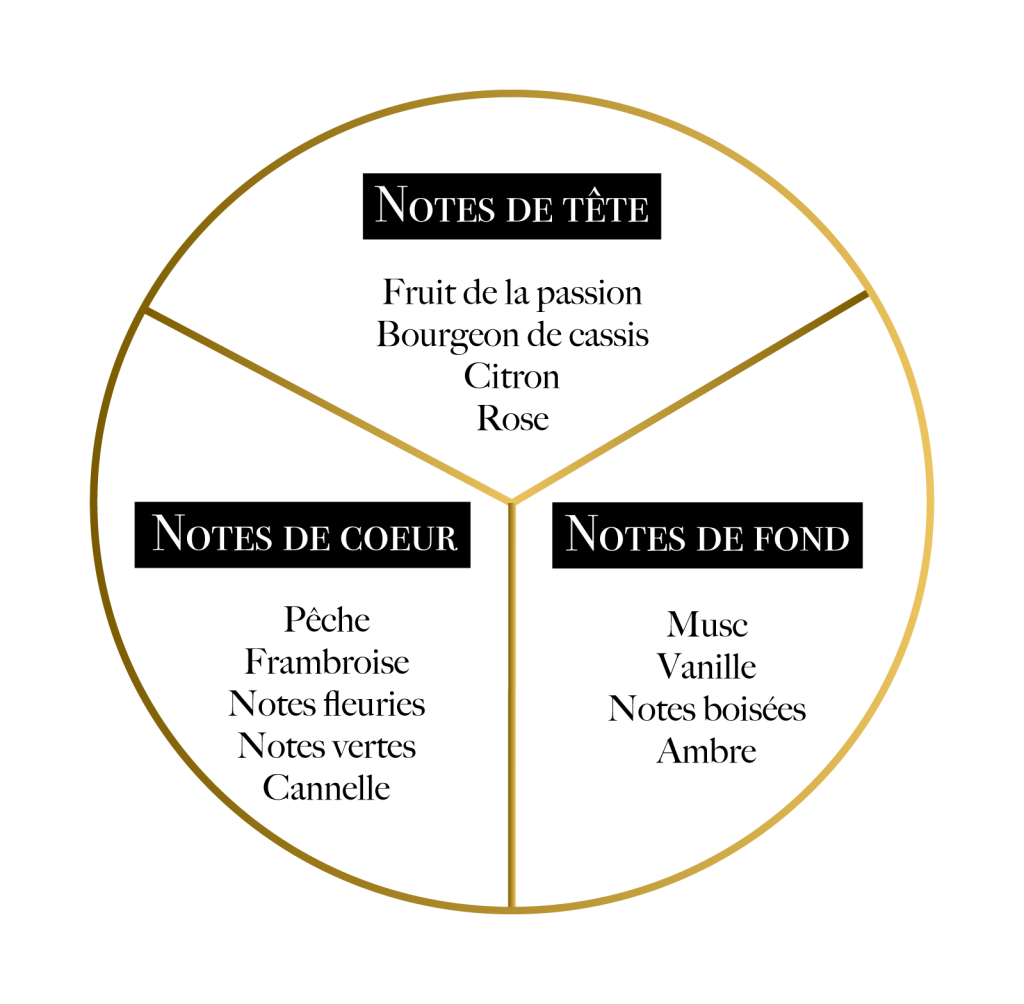 Pulsion opens with a fruity and vibrant whirlwind, blending passion fruit, blackcurrant, lemon, and rose, instantly awakening the senses. At its heart, juicy peach, luscious raspberry, delicate floral notes, fresh green hints, and spicy cinnamon create an irresistible and captivating harmony. Finally, musk and vanilla in the base bring a comforting sweetness and enveloping depth, leaving a memorable impression.